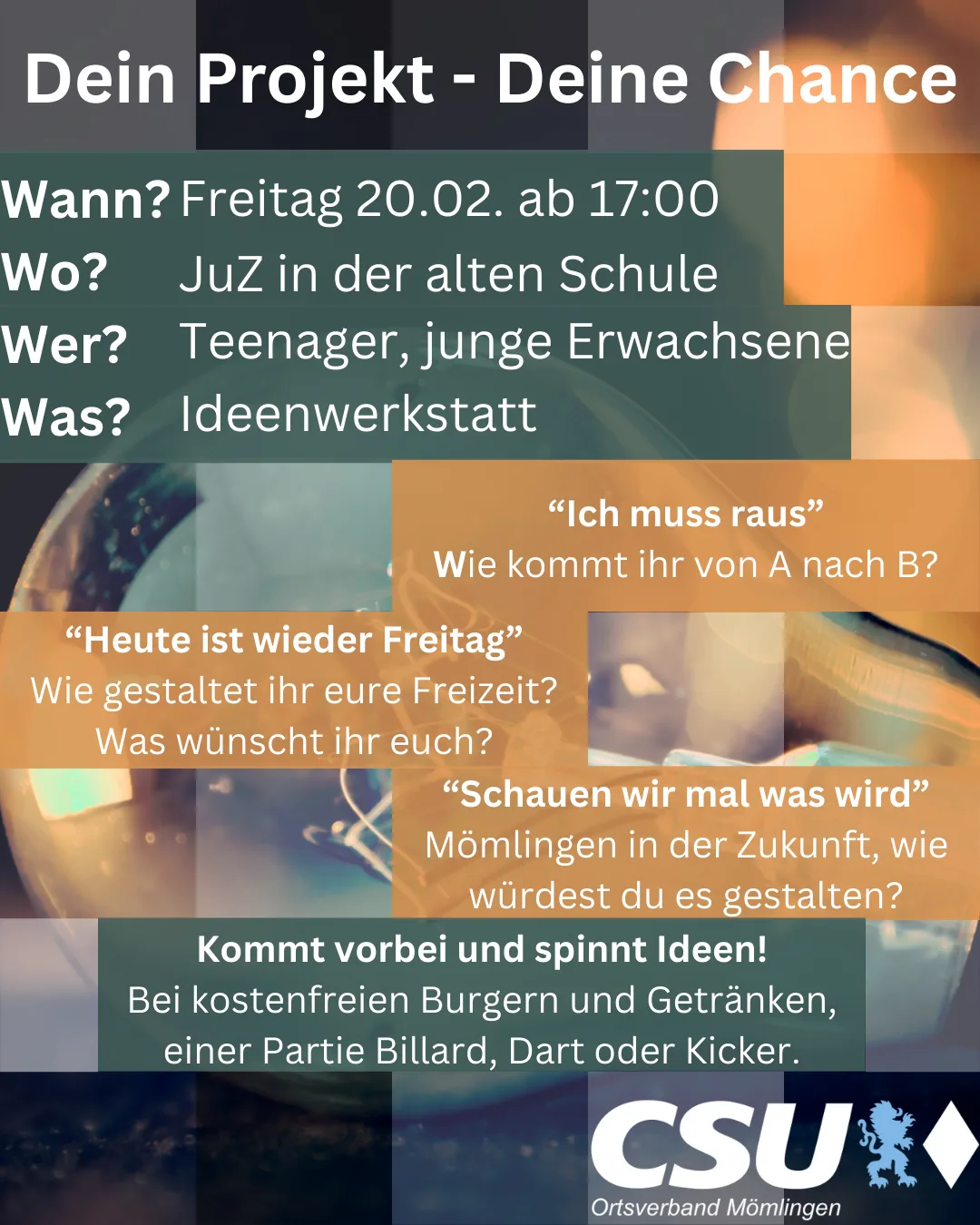Herzliche Einladung an alle Teenager und Jugendlichen zur Zukunftswerkstatt „Dein Projekt – Deine Chance“Wann: Freitag 20.02.2026 ab 17:00 UhrWo: Im JUZ des Bürgerhauses Alte SchuleLasst uns gemeinsam bei kostenlosen Burgern und Getränken, einer Partie...