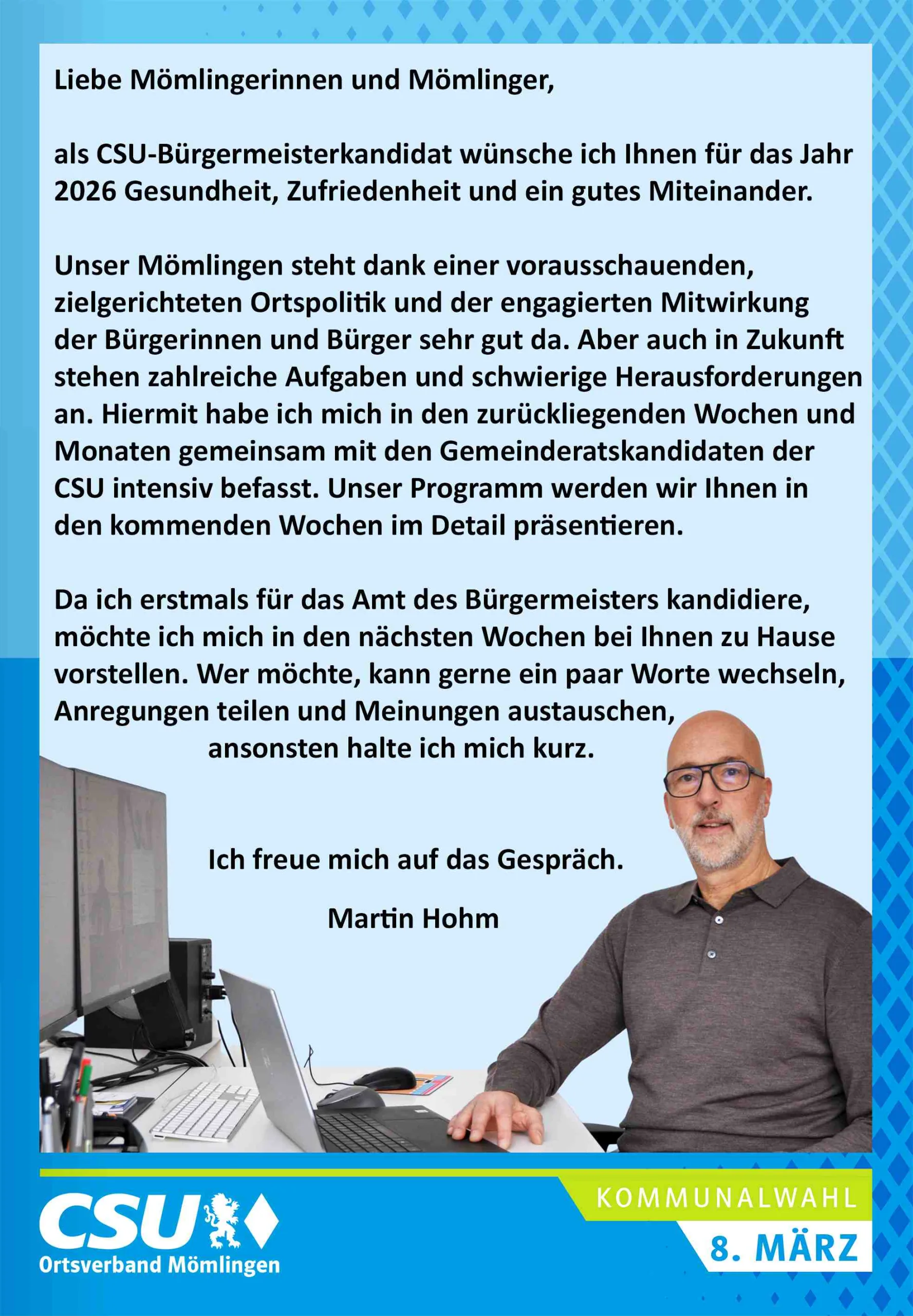 Nominierungsversammlung der CSU Gemeinderäte Nach 18 erfolgreichen Jahren unter Bürgermeister Siegfried Scholtka stellt die CSU Mömlingen ihre Kandidaten für die Kommunalwahl 2026 vor. Martin Hohm wurde bereits im Mai als Bürgermeisterkandidat nominiert. Am 16....